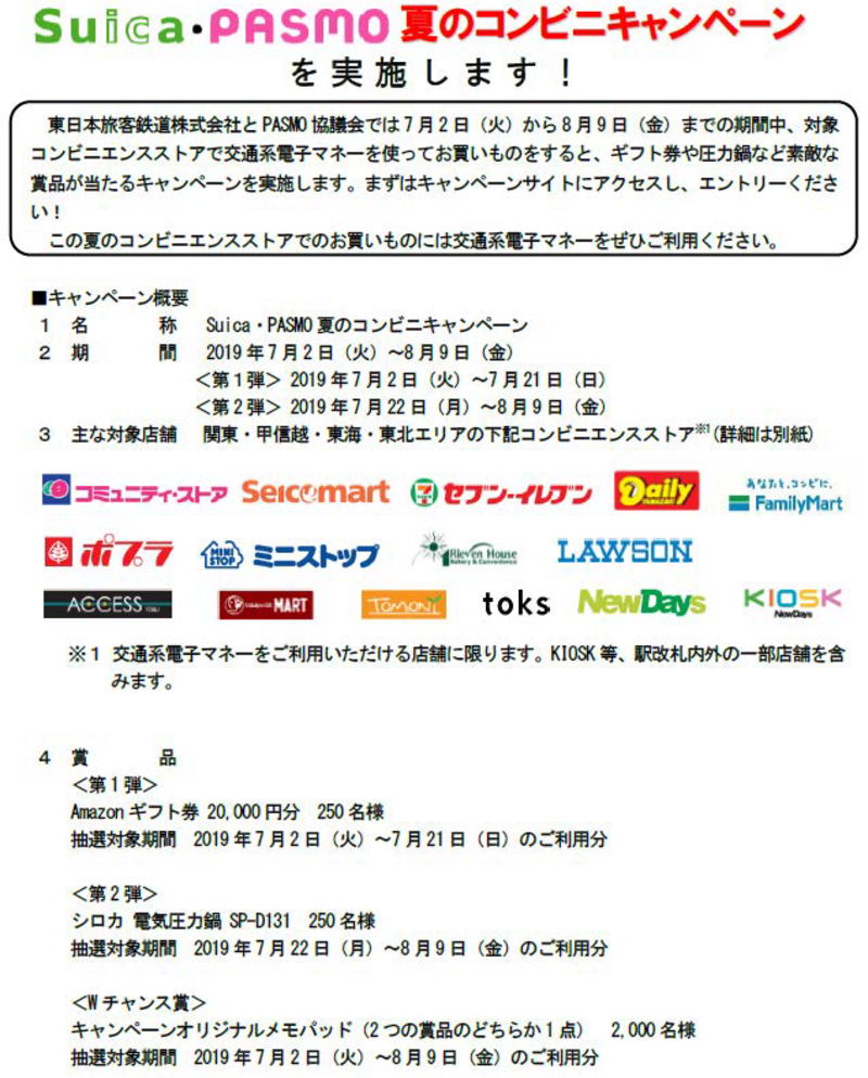 セブンイレブン、ローソン、ファミリーマートなどコンビニエンスストアで、交通系電子マネー(「Kitaca」、「Suica」、「PASMO」、「TOICA」、「manaca(マナカ)」、「ICOCA」、「SUGOCA」、「nimoca」、「はやかけん」の9種類)を使って買いものをすると、ギフト券や圧力鍋などの賞品が当たるキャンペーンが開催されます。