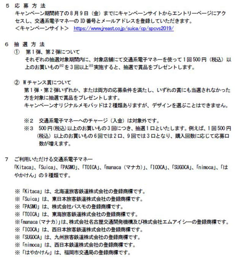応募にはキャンペーン期間終了の8月9日までに、キャンペーンサイト(https://www.jreast.co.jp/suica/cp/spcvs2019/)からエントリーページにアクセスし、交通系電子マネーのID番号とメールアドレスを登録する必要があります。