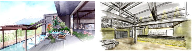 「HOTEL CLAD」(ホテル クラッド)・日帰り温泉施設「木の花の湯」(このはなのゆ)外観(イメージ)=左、 「御殿場アウトレット」(イメージ)=右